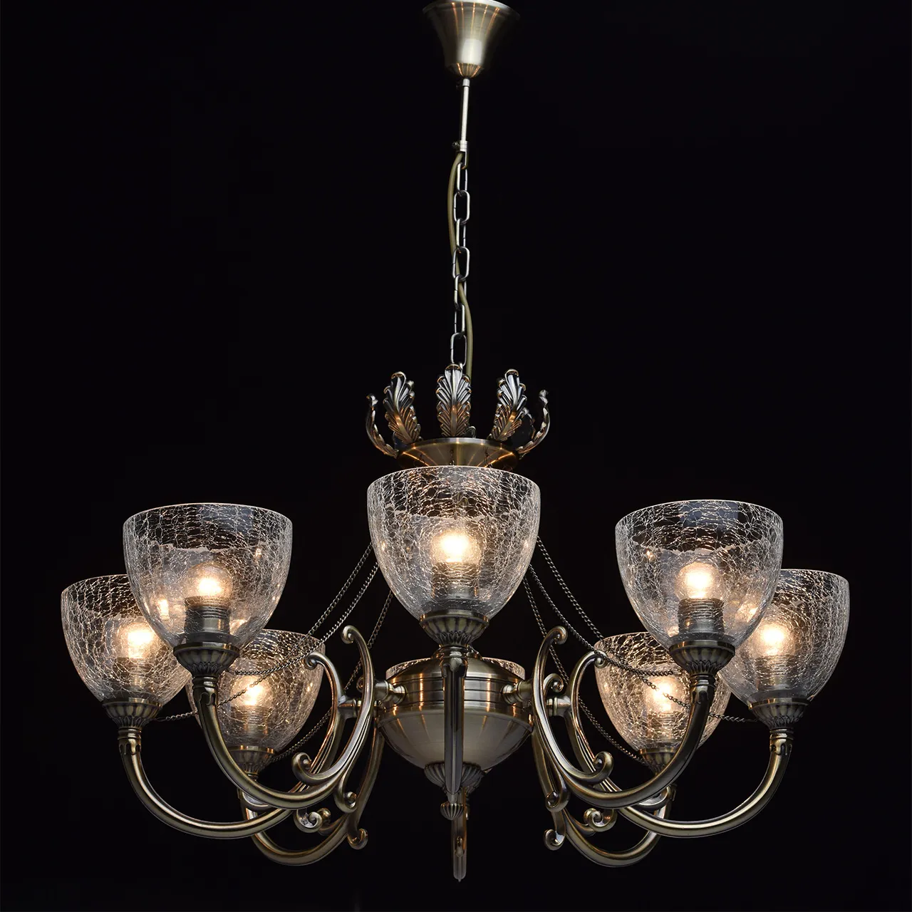 Металлическое основание цвета античной бронзы, плафоны из льдистого стекла, декоративные элементы и