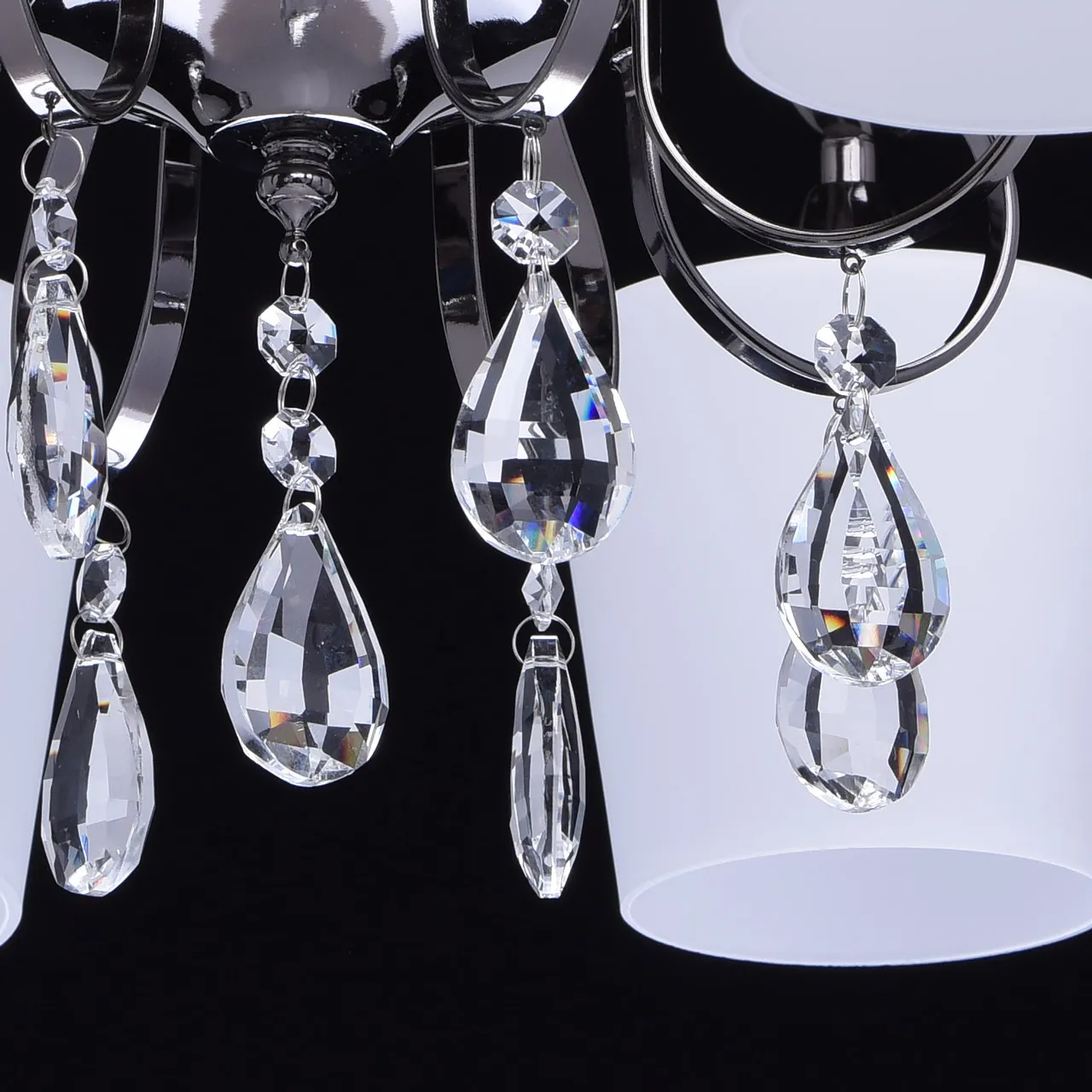 Металлическое основание цвета никеля. Плафоны: стеклянные матированные плафоны. Декор: хрустальные